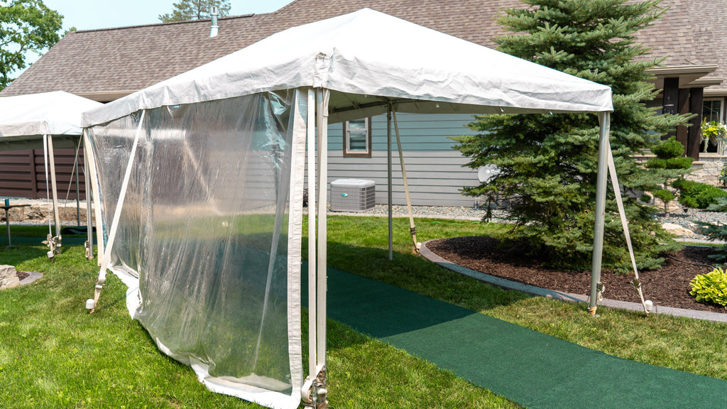 Our 10-by-20 frame tent tops feature a 9” valance for shade and style. The vinyl we use is 16-ounce, American-made, fire-resistant, and UV coated. This means our tent tops comply with NFPA 701-2 standards, which you’ll see on our attached fire tags. We are grateful that we have the opportunity to partner with other American manufacturers and we appreciate our clients who help make this possible.