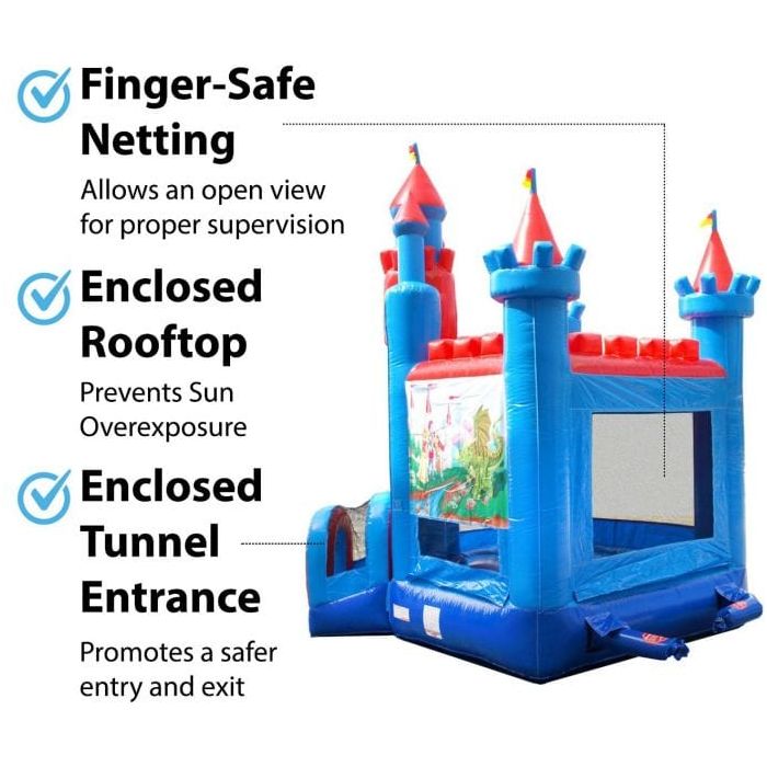 Our bounce houses are equipped with Finger-Safe Netting, that provides a window into the unit so children can be properly supervised. This inflatable bounce house has a maximum weight limit of up to 1000 lbs, so it is recommended to have no more than six children in the bouncer at a time.