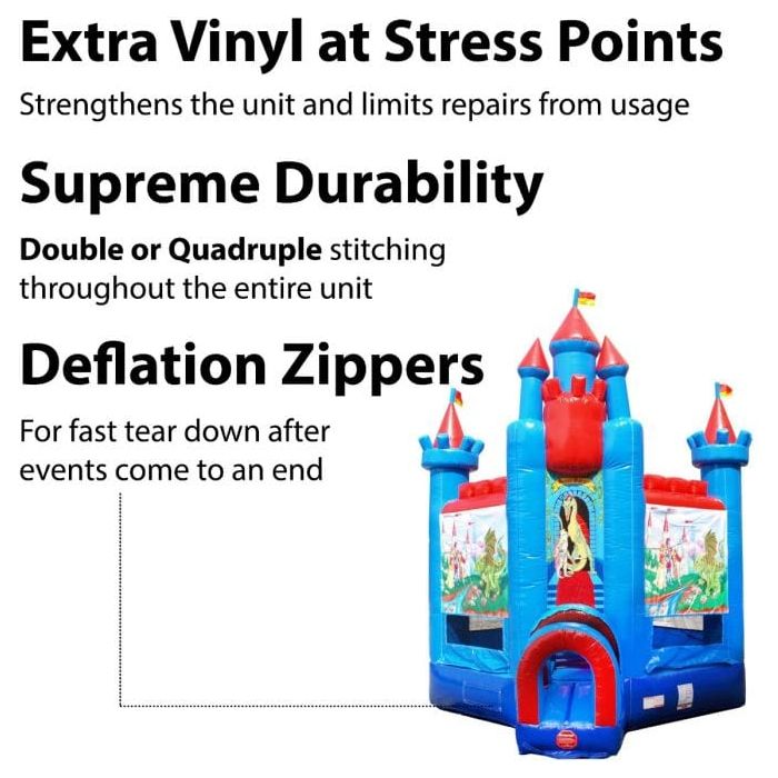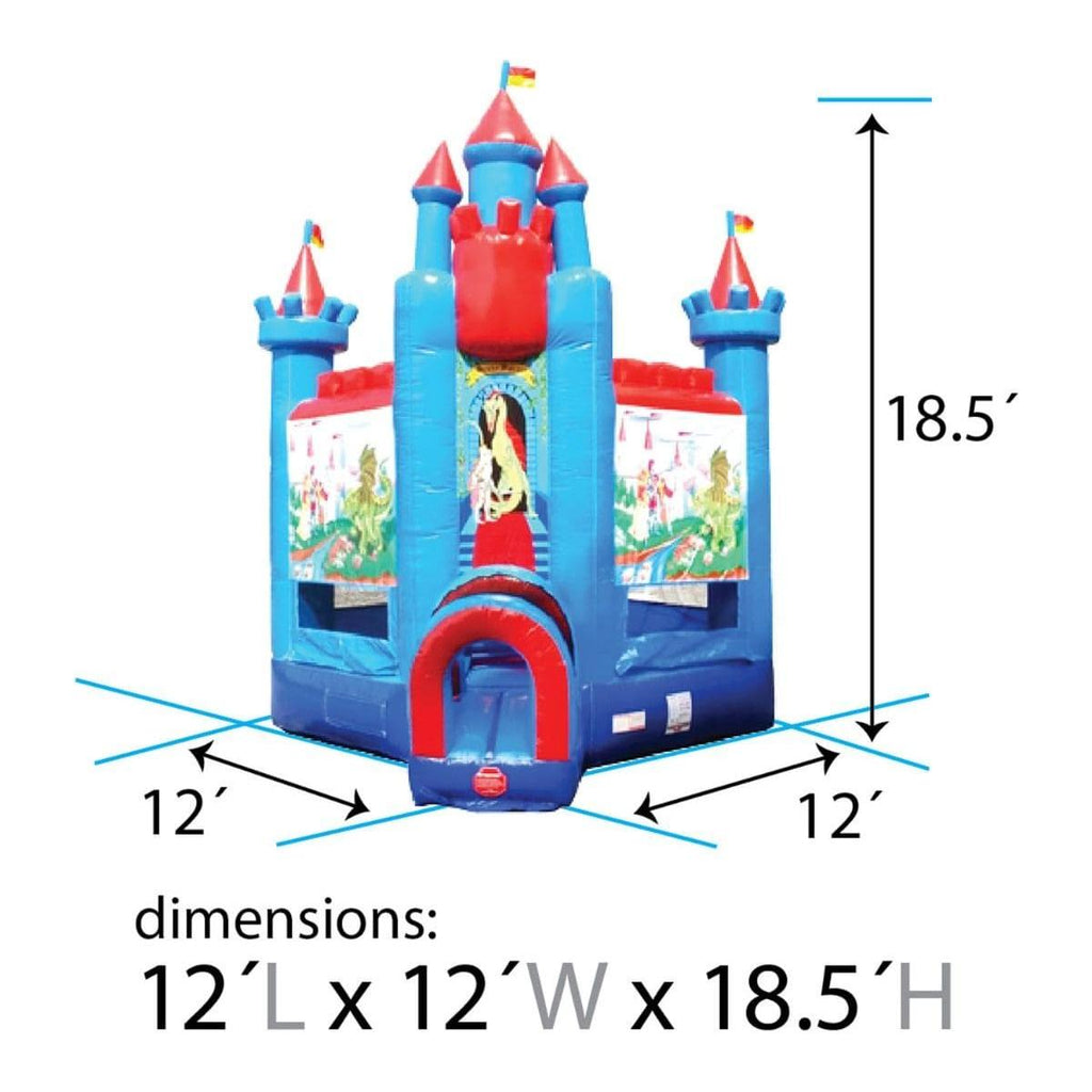 The Deluxe Brave Knight Castle Bounce House offers tremendous fun that is certain to keep kids entertained for hours on end. Like most bouncers, this unit offers all of the same joys and thrills of jumping and bouncing around, but with a unique twist. Unlike most bounce houses that are a simple square, the Brave Knight Castle Bounce House utilizes a special diamond shape that offers a wider play space than a standard bouncer. This brightly-colored bounce house boasts 19' tall Castle spires, kingdom flags and is adorned with imagery of knights and dragons above the entrance. This is an inflatable that all young princes and warriors are sure to fall in love with. Just imagine the attention that this 19-foot tall unit will provide for your rental business, whether it's set up at a carnival, fair or even just at a child's outdoor birthday party. The kids will swoon and gleefully line up for their chance to step inside the Brave Knight Castle Bounce House to prove that they are worthy of being a mighty warrior.