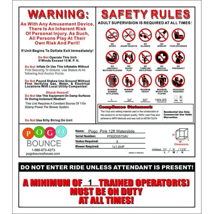 SAFETY INFORMATION: You can have ultimate trust that your Inflatables adopt the absolute highest level safety possible. Crossover Inflatables are constructed from 100% PVC Vinyl, with multi-layer vinyl at all stress areas and double to quadruple stitching used throughout each unit. All materials comply with the Lead Free Toys Act and are Phthalate Free. All netting used is finger safe. Crossover models are fire retardant.