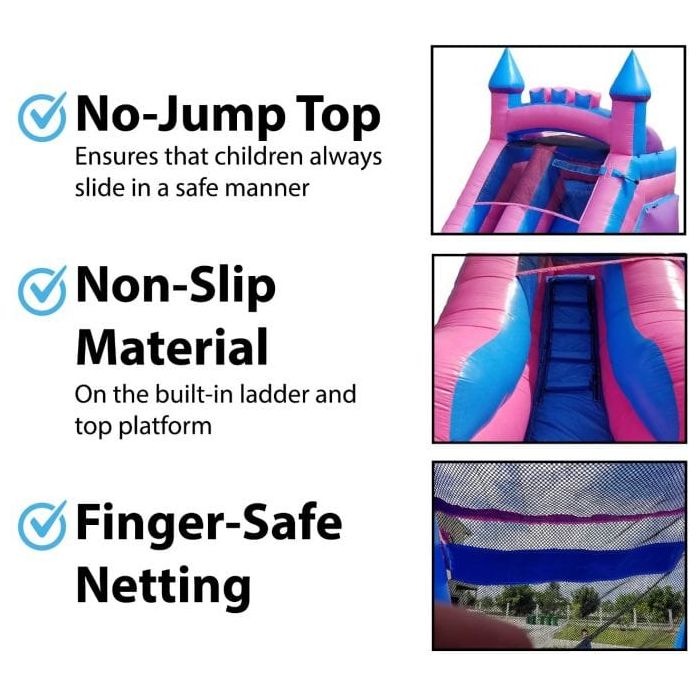 This premium quality inflatable is built to last several seasons of usage with proper care, but also has the safety of your children at heart as well. When you have your child 6 feet up in the air, safety is paramount and our designs have taken appropriate measures to safeguard against injury and improper usage at all times. You can rest easy knowing that this inflatable features our "No Jump Top" with ripstop PVC, finger-safe netting, that ensures children can only use this slide in a safe manner. The splash pool at the base of the inflatable slide has shallow walls that allow for water drainage to keep the water level at an acceptable level for all children utilizing the unit. The built-in ladder lane and top platform feature a non-slip climbing surface.