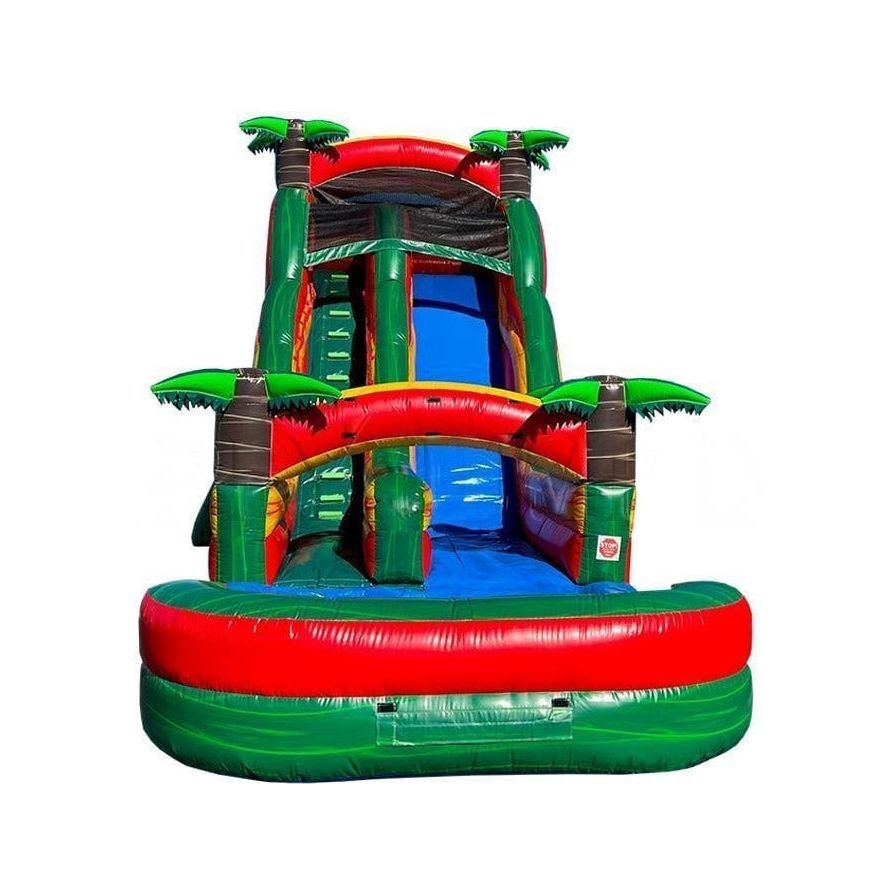 Angel Falls will have you feeling as if you are on a tropical island. Featuring colorful marble designs, a tropical, waterfall theme, a 20' tall slide, and an attached pool, this inflatable is an incredible stand out at any event, occasion, or celebration.