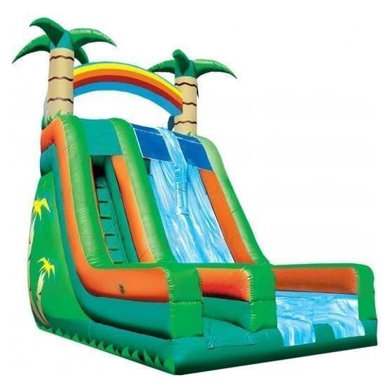 Our 22' Tropical Dual Lane Slide features a radical sliding angle that's sure to get the adrenaline pumping as riders scream down to the bottom. As with all of our slides, the entire top of the slide is meshed in to prevent anyone from standing or jumping down the slide. This slide can also be converted to a hair-raising Water Slide by connecting it to either our Run 'N' Splash Tropical 2 Lane Slide or our Run 'N' Slide Tropical 2 Lane Slide. See catalog for more details. (WARNING: This slide CANNOT be used as a water slide unless it is attached to our a Run 'N' Splash #619 or Run 'N' Slide #616.)