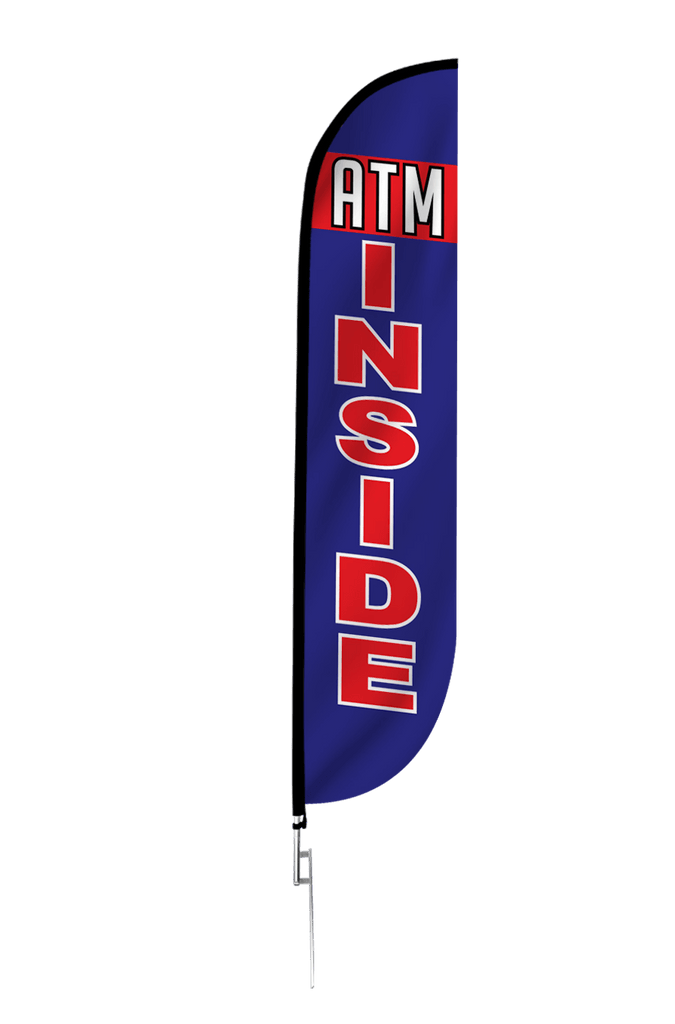 Our 12ft "ATM Inside" blue feather flag is an awesome advertising tool to use for customers who need cash fast! Placing outside your location will let customers know you have an ATM Machine and can lead to more sales once inside! These feather banners are a cost-effective solution to advertise the amenities of your business!