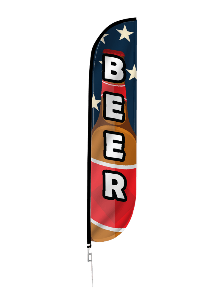 Bring thirsty customers into your location with this 12ft beer feather flag shown in patiotic red, white, and blue design. How much beer do you sell? Want to increase those sales in a real way without shelling out hundreds of dollars on traditional advertising outlets? This feather flag is what you need. Who isn't looking for a cold beer at the end of a hard day of work? The 12ft Beer feather flag will let those thirsty customers just where to get what they want. In-stock and ready to ship, the Beer feather flag is as bold, concise, and patriotic as outdoor advertising products come. Let us get you noticed today.