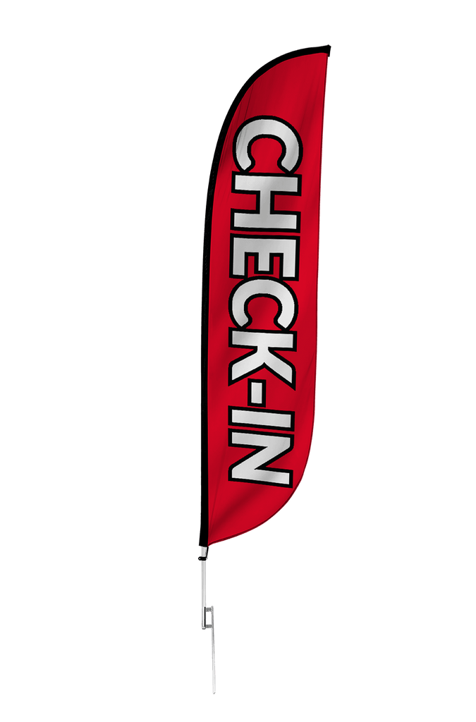 - 1 12ft “CHECK-IN” feather flag in red (as pictured)