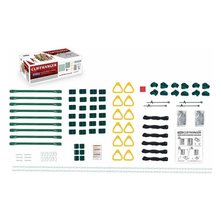 Choose from 3 Design Options up to 240 sq. ft Climbing Area with 17 Activities. Kit includes rings, rocks, rope, chains, rungs, brackets, anchors, hardware and illustrated instructions.