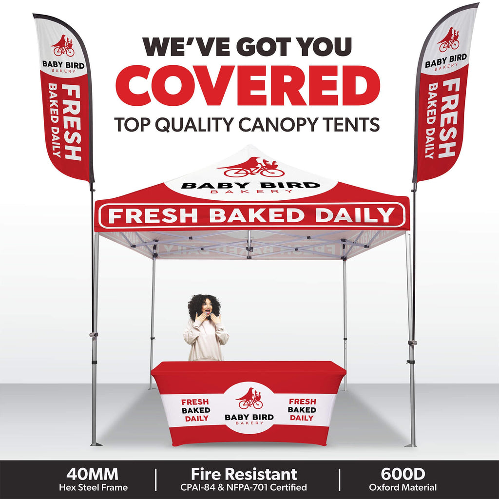 All Orders Over $500 to Receive 100 Multi-Colored Pit Balls Completely Free With Your Purchase - Use Coupon Code PITBALL100Make your brand stand out with the Custom Canopy Tent Package featuring a 6ft Stretch Table Cover and 5ft Custom Feather Flags Mounted to the Tent from Inflatable Bounce House For Sale—an ideal setup for events where a clean, professional presentation and added visibility are key. This package includes a fully customizable canopy top made from durable, water-resistant PU-coated 600D Oxford material, printed in vibrant full color using advanced dye sublimation (CMYK + PMS) for bold, eye-catching graphics. The canopy is fire resistant (CPAI-84 & NFPA-701 certified) and supported by a commercial-grade steel frame with 40mm HEX legs, providing superior strength and stability for both outdoor and indoor events. Instead of sidewalls, this package includes a custom 6ft stretch table cover, perfectly fitted for standard folding tables to showcase your logo or branding in full color. To maximize brand exposure, it also comes with a set of 5ft custom feather flags, professionally printed and securely mounted to the tent frame for high-impact visibility. A nylon carry bag is included for easy transport. Perfect for trade shows, farmers markets, and promotional events, this tent package includes free professional design services to help bring your vision to life.