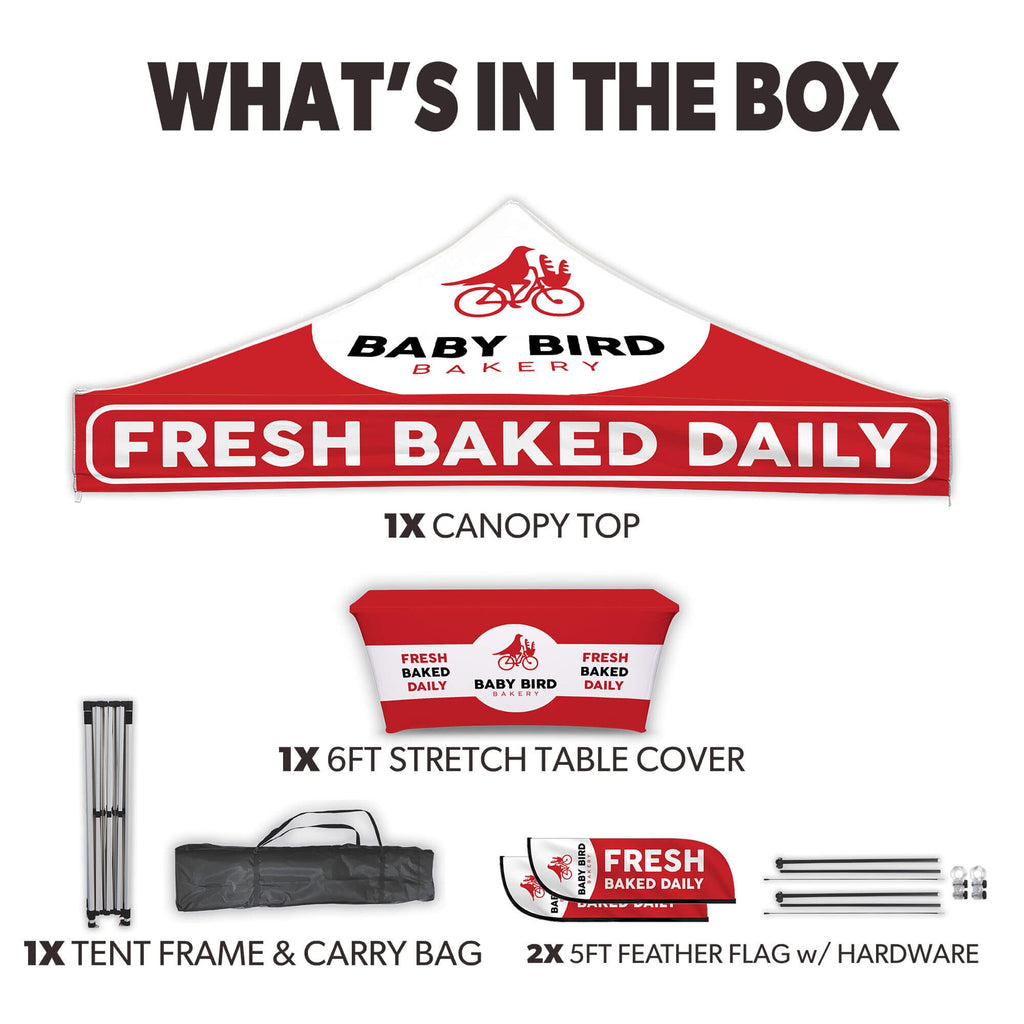 If you happen to see another online shop that offers a lower price than us within six months of your date please let us know and we’ll be happy to refund the difference on your original payment method. Moreover, because we are consistently working with our suppliers to get better rates we know that you can feel very comfortable and confident that you are seeing the best prices that can be provided for the products listed on our site. Moving forward if you find the same item that we carry on another website that has a lower price please submit that to us within six months of your purchase date and we will refund you the difference. If it is a case of seeing a lower price on another website and we need to send a partial refund simply email us the link to the exact product and brand from our site and also the link from our competitors site so we can inspect the pricing. Again this needs to be within six months from the date of your order and we will review your submission and apply a credit if necessary. Our 100% Shoppers Best Price Guarantee has some limitations: The item must have already been purchased from our site prior to asking for this to be reviewed and submitted. This does not include rebate programs or specific retailer programs such as buy three get one free type offers or any combination such as that are not eligible The item will need to be in stock from the competitors site that you’re submitting the information from The competitor must be an online store, they may not have a retail location (warehouse, showroom, or physical location) The website cannot be a wholesaler, liquidator, distributor, or auction website. Examples are eBay, Liquadation.com, Via Trading, overstock, etc. The competitor must also be someone who has been authorized by the supplier and/or manufacturer to resell the product you are inquiring about The Shoppers Best Price Policy must also include the product listing price and the shipping total, but will exclude any sales tax that gets added at the final purchasing invoiceMake your brand stand out with the Custom Canopy Tent Package featuring a 6ft Stretch Table Cover and 5ft Custom Feather Flags Mounted to the Tent from Inflatable Bounce House For Sale—an ideal setup for events where a clean, professional presentation and added visibility are key. This package includes a fully customizable canopy top made from durable, water-resistant PU-coated 600D Oxford material, printed in vibrant full color using advanced dye sublimation (CMYK + PMS) for bold, eye-catching graphics. The canopy is fire resistant (CPAI-84 & NFPA-701 certified) and supported by a commercial-grade steel frame with 40mm HEX legs, providing superior strength and stability for both outdoor and indoor events. Instead of sidewalls, this package includes a custom 6ft stretch table cover, perfectly fitted for standard folding tables to showcase your logo or branding in full color. To maximize brand exposure, it also comes with a set of 5ft custom feather flags, professionally printed and securely mounted to the tent frame for high-impact visibility. A nylon carry bag is included for easy transport. Perfect for trade shows, farmers markets, and promotional events, this tent package includes free professional design services to help bring your vision to life.