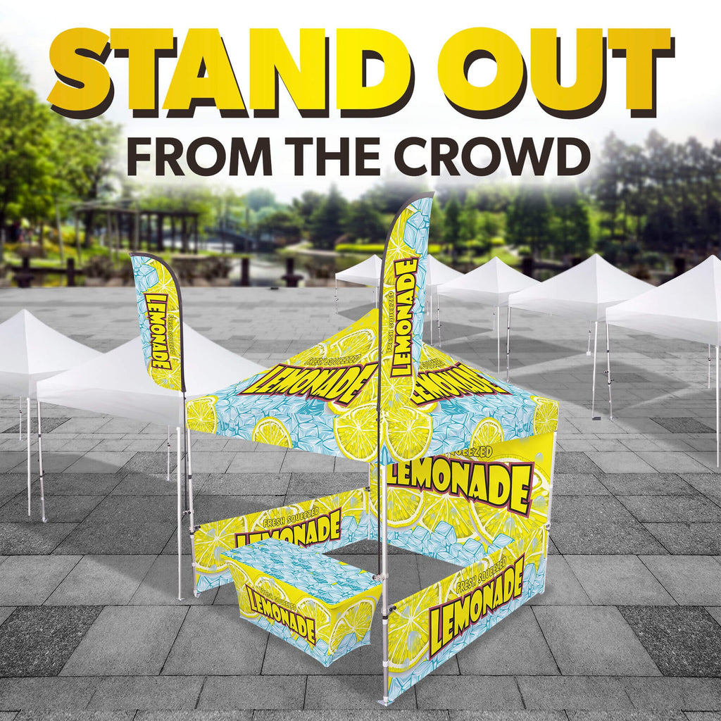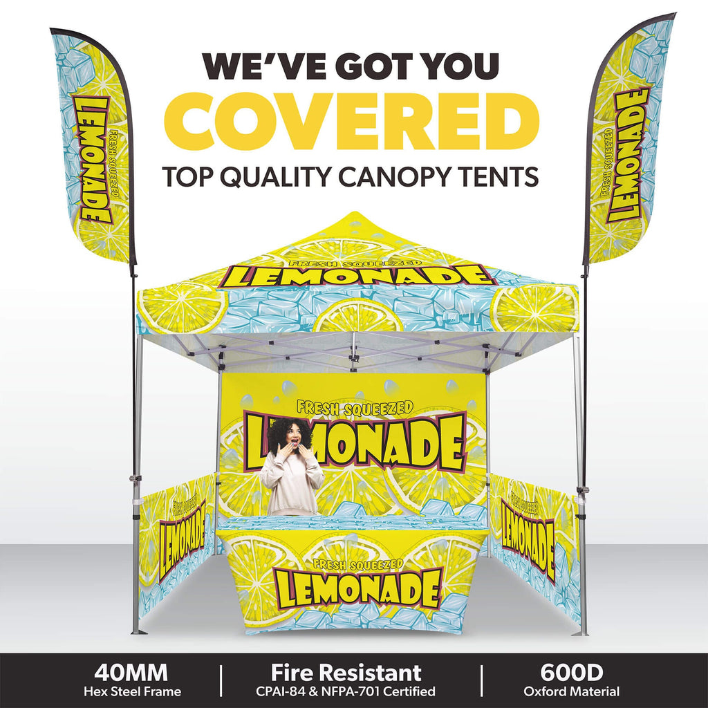 Make your brand stand out with the Custom Canopy Tent Package featuring a Full Back Wall, Two Half Side Walls with Mounting Hardware, 6ft Stretch Table Cover, and 5ft Custom Feather Flags Mounted to the Tent from LookOurWay—an all-in-one solution designed for maximum visibility, professional presentation, and versatile coverage. This package includes a fully customizable canopy top, a full custom back wall, and two half side walls with mounting hardware, all crafted from durable, water-resistant PU-coated 600D Oxford material and printed in vibrant full color using advanced dye sublimation (CMYK + PMS) for bold, eye-catching graphics. The canopy, back wall, and side walls are fire resistant (CPAI-84 & NFPA-701 certified) and supported by a commercial-grade steel frame with 40mm HEX legs, providing superior strength and stability for both indoor and outdoor events. Instead of full sidewalls, the package includes a custom 6ft stretch table cover designed to perfectly fit standard folding tables while showcasing your logo or branding in full color. To enhance brand exposure even further, it also includes a set of 5ft custom feather flags, professionally printed and securely mounted to the tent frame for high-impact visibility. A nylon carry bag is provided for easy transport. Perfect for trade shows, farmers markets, and promotional events, this tent package includes free professional design services to help bring your vision to life.