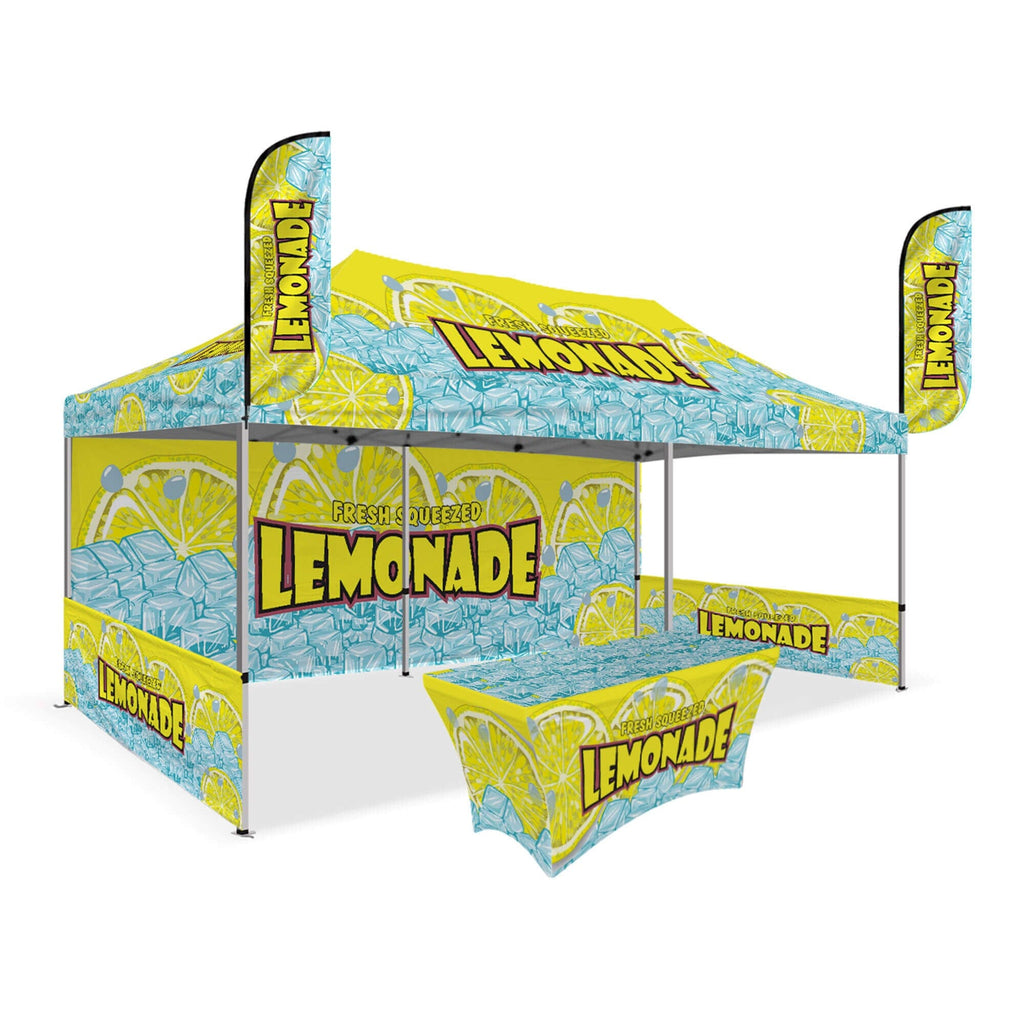 All Orders Over $500 to Receive 100 Multi-Colored Pit Balls Completely Free With Your Purchase - Use Coupon Code PITBALL100Make your brand stand out with the Custom Canopy Tent Package featuring a Full Back Wall, Two Half Side Walls with Mounting Hardware, 6ft Stretch Table Cover, and 5ft Custom Feather Flags Mounted to the Tent from LookOurWay—an all-in-one solution designed for maximum visibility, professional presentation, and versatile coverage. This package includes a fully customizable canopy top, a full custom back wall, and two half side walls with mounting hardware, all crafted from durable, water-resistant PU-coated 600D Oxford material and printed in vibrant full color using advanced dye sublimation (CMYK + PMS) for bold, eye-catching graphics. The canopy, back wall, and side walls are fire resistant (CPAI-84 & NFPA-701 certified) and supported by a commercial-grade steel frame with 40mm HEX legs, providing superior strength and stability for both indoor and outdoor events. Instead of full sidewalls, the package includes a custom 6ft stretch table cover designed to perfectly fit standard folding tables while showcasing your logo or branding in full color. To enhance brand exposure even further, it also includes a set of 5ft custom feather flags, professionally printed and securely mounted to the tent frame for high-impact visibility. A nylon carry bag is provided for easy transport. Perfect for trade shows, farmers markets, and promotional events, this tent package includes free professional design services to help bring your vision to life.
