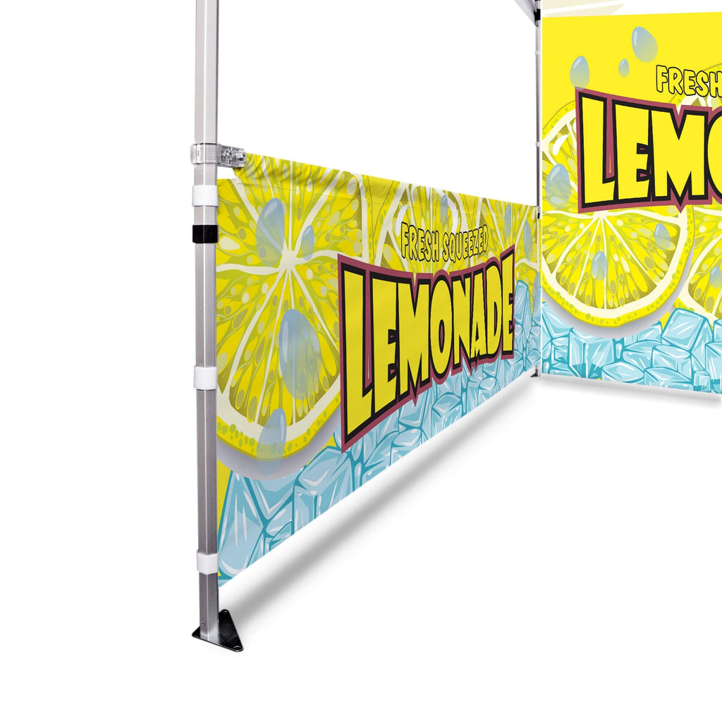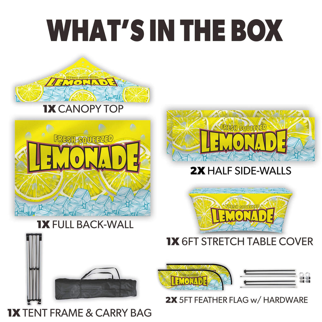 If you happen to see another online shop that offers a lower price than us within six months of your date please let us know and we’ll be happy to refund the difference on your original payment method. Moreover, because we are consistently working with our suppliers to get better rates we know that you can feel very comfortable and confident that you are seeing the best prices that can be provided for the products listed on our site. Moving forward if you find the same item that we carry on another website that has a lower price please submit that to us within six months of your purchase date and we will refund you the difference. If it is a case of seeing a lower price on another website and we need to send a partial refund simply email us the link to the exact product and brand from our site and also the link from our competitors site so we can inspect the pricing. Again this needs to be within six months from the date of your order and we will review your submission and apply a credit if necessary. Our 100% Shoppers Best Price Guarantee has some limitations: The item must have already been purchased from our site prior to asking for this to be reviewed and submitted. This does not include rebate programs or specific retailer programs such as buy three get one free type offers or any combination such as that are not eligible The item will need to be in stock from the competitors site that you’re submitting the information from The competitor must be an online store, they may not have a retail location (warehouse, showroom, or physical location) The website cannot be a wholesaler, liquidator, distributor, or auction website. Examples are eBay, Liquadation.com, Via Trading, overstock, etc. The competitor must also be someone who has been authorized by the supplier and/or manufacturer to resell the product you are inquiring about The Shoppers Best Price Policy must also include the product listing price and the shipping total, but will exclude any sales tax that gets added at the final purchasing invoiceMake your brand stand out with the Custom Canopy Tent Package featuring a Full Back Wall, Two Half Side Walls with Mounting Hardware, 6ft Stretch Table Cover, and 5ft Custom Feather Flags Mounted to the Tent from LookOurWay—an all-in-one solution designed for maximum visibility, professional presentation, and versatile coverage. This package includes a fully customizable canopy top, a full custom back wall, and two half side walls with mounting hardware, all crafted from durable, water-resistant PU-coated 600D Oxford material and printed in vibrant full color using advanced dye sublimation (CMYK + PMS) for bold, eye-catching graphics. The canopy, back wall, and side walls are fire resistant (CPAI-84 & NFPA-701 certified) and supported by a commercial-grade steel frame with 40mm HEX legs, providing superior strength and stability for both indoor and outdoor events. Instead of full sidewalls, the package includes a custom 6ft stretch table cover designed to perfectly fit standard folding tables while showcasing your logo or branding in full color. To enhance brand exposure even further, it also includes a set of 5ft custom feather flags, professionally printed and securely mounted to the tent frame for high-impact visibility. A nylon carry bag is provided for easy transport. Perfect for trade shows, farmers markets, and promotional events, this tent package includes free professional design services to help bring your vision to life.