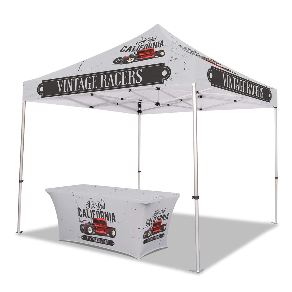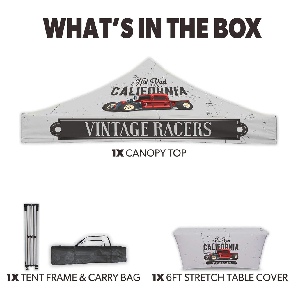 If you happen to see another online shop that offers a lower price than us within six months of your date please let us know and we’ll be happy to refund the difference on your original payment method. Moreover, because we are consistently working with our suppliers to get better rates we know that you can feel very comfortable and confident that you are seeing the best prices that can be provided for the products listed on our site. Moving forward if you find the same item that we carry on another website that has a lower price please submit that to us within six months of your purchase date and we will refund you the difference. If it is a case of seeing a lower price on another website and we need to send a partial refund simply email us the link to the exact product and brand from our site and also the link from our competitors site so we can inspect the pricing. Again this needs to be within six months from the date of your order and we will review your submission and apply a credit if necessary. Our 100% Shoppers Best Price Guarantee has some limitations: The item must have already been purchased from our site prior to asking for this to be reviewed and submitted. This does not include rebate programs or specific retailer programs such as buy three get one free type offers or any combination such as that are not eligible The item will need to be in stock from the competitors site that you’re submitting the information from The competitor must be an online store, they may not have a retail location (warehouse, showroom, or physical location) The website cannot be a wholesaler, liquidator, distributor, or auction website. Examples are eBay, Liquadation.com, Via Trading, overstock, etc. The competitor must also be someone who has been authorized by the supplier and/or manufacturer to resell the product you are inquiring about The Shoppers Best Price Policy must also include the product listing price and the shipping total, but will exclude any sales tax that gets added at the final purchasing invoiceMake your brand stand out with the Custom Canopy Tent Package with 6ft Stretch Table Cover from LookOurWay—an ideal setup for events where clean, professional presentation is key. This package includes a fully customizable canopy top made from durable, water-resistant PU-coated 600D Oxford material, printed in vibrant full color using advanced dye sublimation (CMYK + PMS) for bold, eye-catching graphics. The canopy is fire resistant (CPAI-84 & NFPA-701 certified) and supported by a commercial-grade steel frame with 40mm HEX legs, offering superior strength and stability for any outdoor or indoor event. Instead of sidewalls, this package includes a custom 6ft stretch table cover, designed to perfectly fit standard folding tables while showcasing your logo or branding in full color. A nylon carry bag is also included for easy transport. Perfect for trade shows, farmers markets, and promotional events, this tent package includes free professional design services to help bring your vision to life.