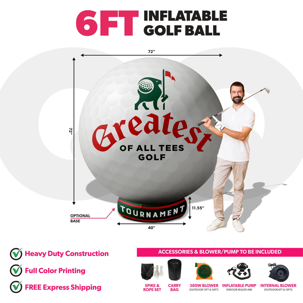 If you happen to see another online shop that offers a lower price than us within six months of your date please let us know and we’ll be happy to refund the difference on your original payment method. Moreover, because we are consistently working with our suppliers to get better rates we know that you can feel very comfortable and confident that you are seeing the best prices that can be provided for the products listed on our site. Moving forward if you find the same item that we carry on another website that has a lower price please submit that to us within six months of your purchase date and we will refund you the difference. If it is a case of seeing a lower price on another website and we need to send a partial refund simply email us the link to the exact product and brand from our site and also the link from our competitors site so we can inspect the pricing. Again this needs to be within six months from the date of your order and we will review your submission and apply a credit if necessary. Our 100% Shoppers Best Price Guarantee has some limitations: The item must have already been purchased from our site prior to asking for this to be reviewed and submitted. This does not include rebate programs or specific retailer programs such as buy three get one free type offers or any combination such as that are not eligible The item will need to be in stock from the competitors site that you’re submitting the information from The competitor must be an online store, they may not have a retail location (warehouse, showroom, or physical location) The website cannot be a wholesaler, liquidator, distributor, or auction website. Examples are eBay, Liquadation.com, Via Trading, overstock, etc. The competitor must also be someone who has been authorized by the supplier and/or manufacturer to resell the product you are inquiring about The Shoppers Best Price Policy must also include the product listing price and the shipping total, but will exclude any sales tax that gets added at the final purchasing invoiceDrive attention and excitement with a Custom Giant Inflatable Golf Ball - the ultimate show-stopping centerpiece for tournaments, golf expos, country club events, and brand activations. Designed to stand out on the green or the trade-show floor, this oversized inflatable golf ball features 360° full-color printing to showcase your logo, sponsor, or event design in crisp, photo-ready detail. Perfect for photo ops, crowd engagement, and experiential marketing, it transforms any space into a hole-in-one promotional moment.