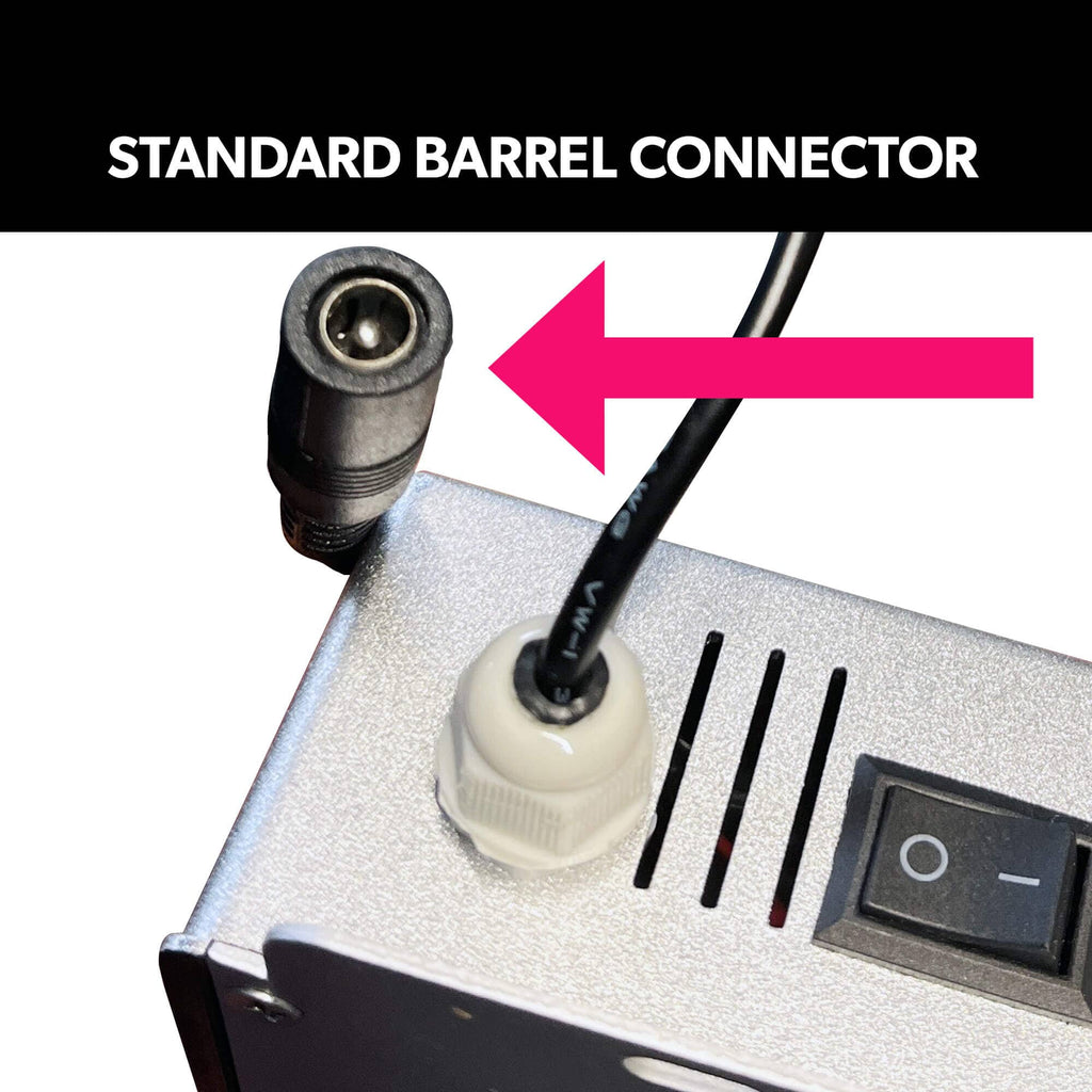 Power Supply: The 50W battery-powered gobo will work with any 12V power source that has a standard barrel connector (see images for reference). We recommend using a 12v Lithium ion Battery Pack or Power Bank. Please reach out to our sales team and we can help you with some recommendations.