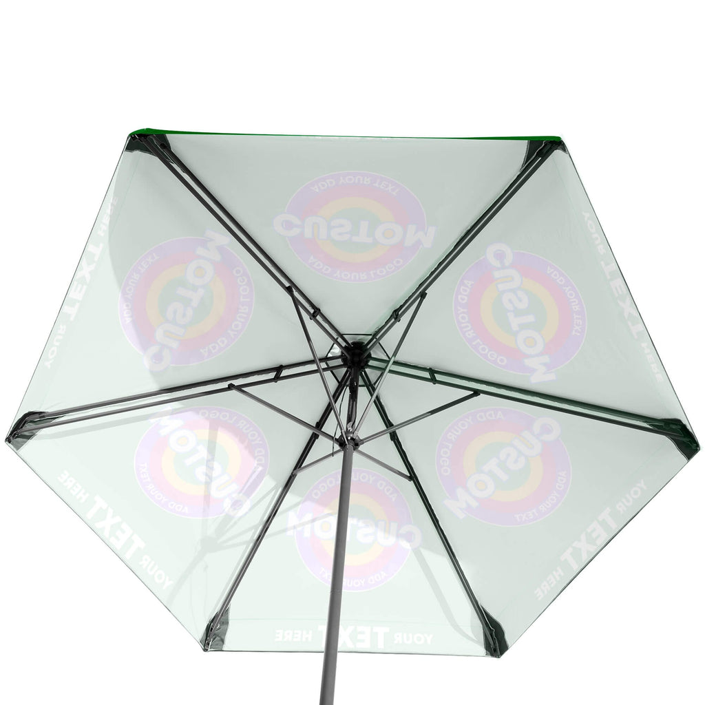 If you happen to see another online shop that offers a lower price than us within six months of your date please let us know and we’ll be happy to refund the difference on your original payment method. Moreover, because we are consistently working with our suppliers to get better rates we know that you can feel very comfortable and confident that you are seeing the best prices that can be provided for the products listed on our site. Moving forward if you find the same item that we carry on another website that has a lower price please submit that to us within six months of your purchase date and we will refund you the difference. If it is a case of seeing a lower price on another website and we need to send a partial refund simply email us the link to the exact product and brand from our site and also the link from our competitors site so we can inspect the pricing. Again this needs to be within six months from the date of your order and we will review your submission and apply a credit if necessary. Our 100% Shoppers Best Price Guarantee has some limitations: The item must have already been purchased from our site prior to asking for this to be reviewed and submitted. This does not include rebate programs or specific retailer programs such as buy three get one free type offers or any combination such as that are not eligible The item will need to be in stock from the competitors site that you’re submitting the information from The competitor must be an online store, they may not have a retail location (warehouse, showroom, or physical location) The website cannot be a wholesaler, liquidator, distributor, or auction website. Examples are eBay, Liquadation.com, Via Trading, overstock, etc. The competitor must also be someone who has been authorized by the supplier and/or manufacturer to resell the product you are inquiring about The Shoppers Best Price Policy must also include the product listing price and the shipping total, but will exclude any sales tax that gets added at the final purchasing invoiceOur six-panel custom patio umbrella offers optimal shade and sun protection, keeping customers cool while boosting brand visibility for your business or storefront. The umbrella top measures 6ft wide along each of the sides and a full 9ft diagonally at its widest point. Each promotional grade market style umbrella is handcrafted using our premium 300 Denier Oxford Polyester Fabric, that is printed in full-color using our industry leading Dye Sublimation process. With no limitation to where they can be used these premium umbrellas are guaranteed to attract attention to any restaurants, bar, cafe, coffee shops, outdoor events, and even business lunch & break areas.