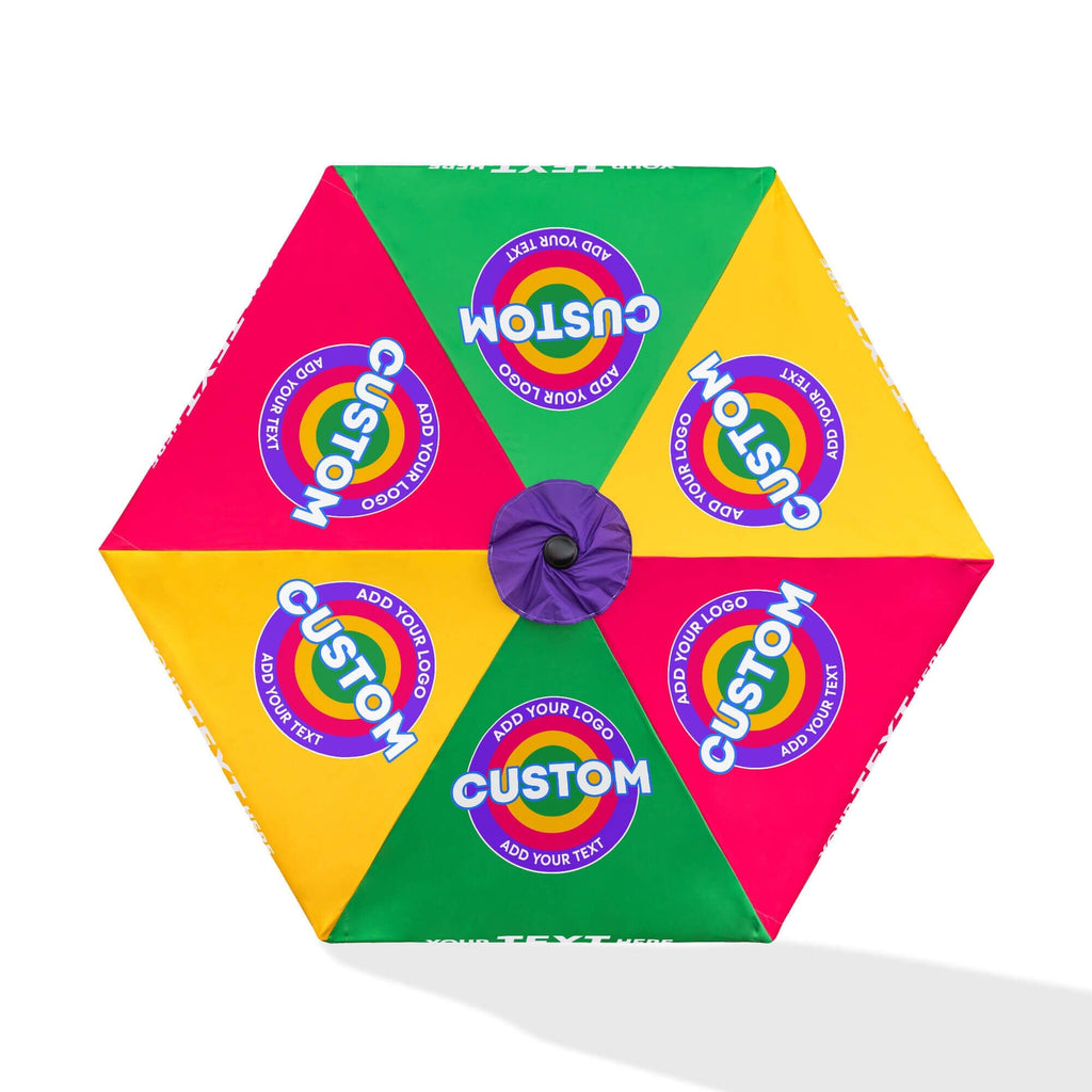 All Orders Over $500 to Receive 100 Multi-Colored Pit Balls Completely Free With Your Purchase - Use Coupon Code PITBALL100Our six-panel custom patio umbrella offers optimal shade and sun protection, keeping customers cool while boosting brand visibility for your business or storefront. The umbrella top measures 6ft wide along each of the sides and a full 9ft diagonally at its widest point. Each promotional grade market style umbrella is handcrafted using our premium 300 Denier Oxford Polyester Fabric, that is printed in full-color using our industry leading Dye Sublimation process. With no limitation to where they can be used these premium umbrellas are guaranteed to attract attention to any restaurants, bar, cafe, coffee shops, outdoor events, and even business lunch & break areas.