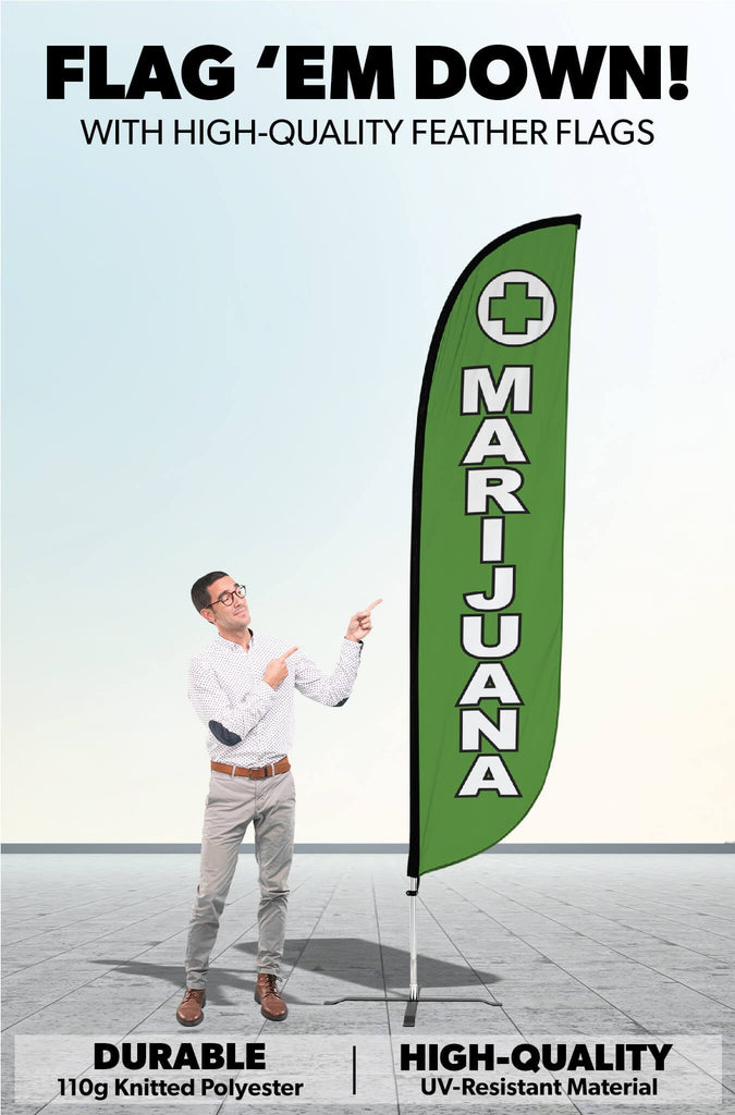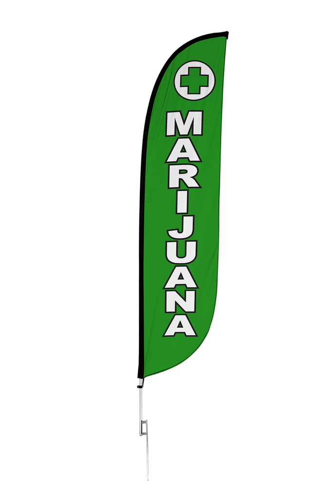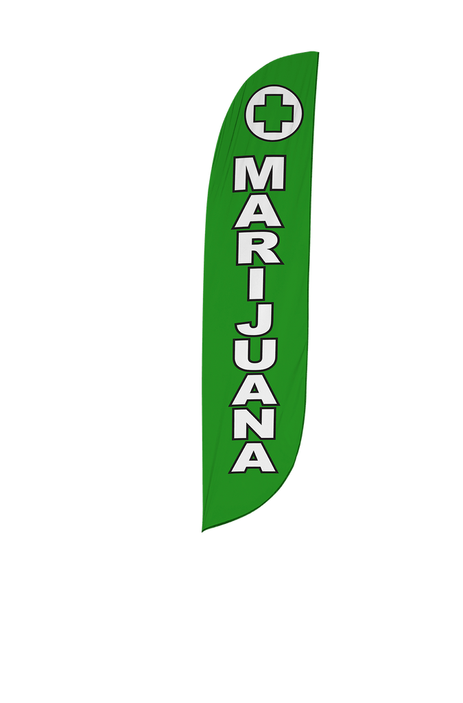 Help drive traffic and increase sales to your dispensary or smoke shop with our bright green and vibrant Marijuana flag! With the text “MARIJUANA”, a medical cross picture, and a green background, customers will know exactly what business you are in These feather banners have been proven to generate attention which have helped thousand of businesses generate more sales and foot traffic!