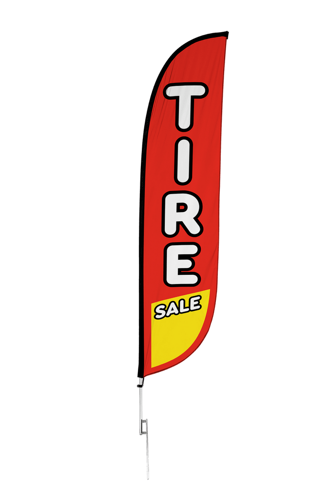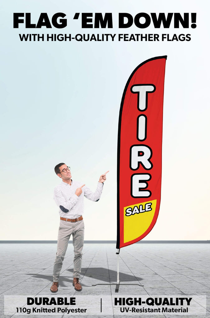 If you happen to see another online shop that offers a lower price than us within six months of your date please let us know and we’ll be happy to refund the difference on your original payment method. Moreover, because we are consistently working with our suppliers to get better rates we know that you can feel very comfortable and confident that you are seeing the best prices that can be provided for the products listed on our site. Moving forward if you find the same item that we carry on another website that has a lower price please submit that to us within six months of your purchase date and we will refund you the difference. If it is a case of seeing a lower price on another website and we need to send a partial refund simply email us the link to the exact product and brand from our site and also the link from our competitors site so we can inspect the pricing. Again this needs to be within six months from the date of your order and we will review your submission and apply a credit if necessary. Our 100% Shoppers Best Price Guarantee has some limitations: The item must have already been purchased from our site prior to asking for this to be reviewed and submitted. This does not include rebate programs or specific retailer programs such as buy three get one free type offers or any combination such as that are not eligible The item will need to be in stock from the competitors site that you’re submitting the information from The competitor must be an online store, they may not have a retail location (warehouse, showroom, or physical location) The website cannot be a wholesaler, liquidator, distributor, or auction website. Examples are eBay, Liquadation.com, Via Trading, overstock, etc. The competitor must also be someone who has been authorized by the supplier and/or manufacturer to resell the product you are inquiring about The Shoppers Best Price Policy must also include the product listing price and the shipping total, but will exclude any sales tax that gets added at the final purchasing invoiceWhen you have a sale, promotion, or event at your business, you want to let everyone know! This Tire Sale Feather Flag delivers the message about your tire sale loud and clear so potential customers can take advantage of your special offer.