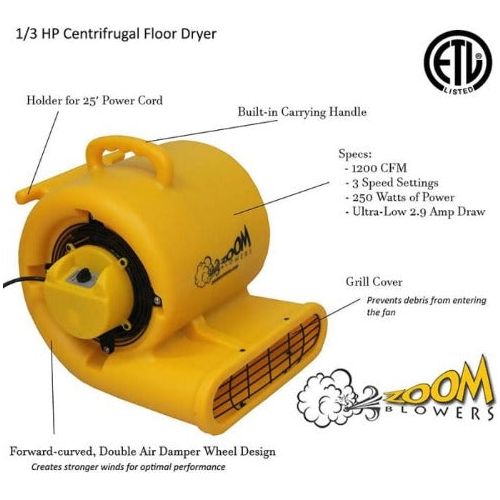 Zoom Centrifugal Floor Dryers are designed to dry or ventilate anything related to your business or home. The dryers use a forward curved double air damper wheel design, which makes the wind stronger. The motor is a high quality silicon steel sheet stamping, which has very low power consumption and temperature rise. A grill cover keeps debris out of the fan.
