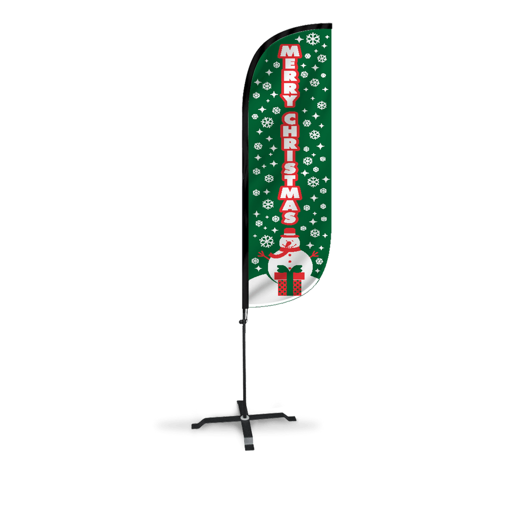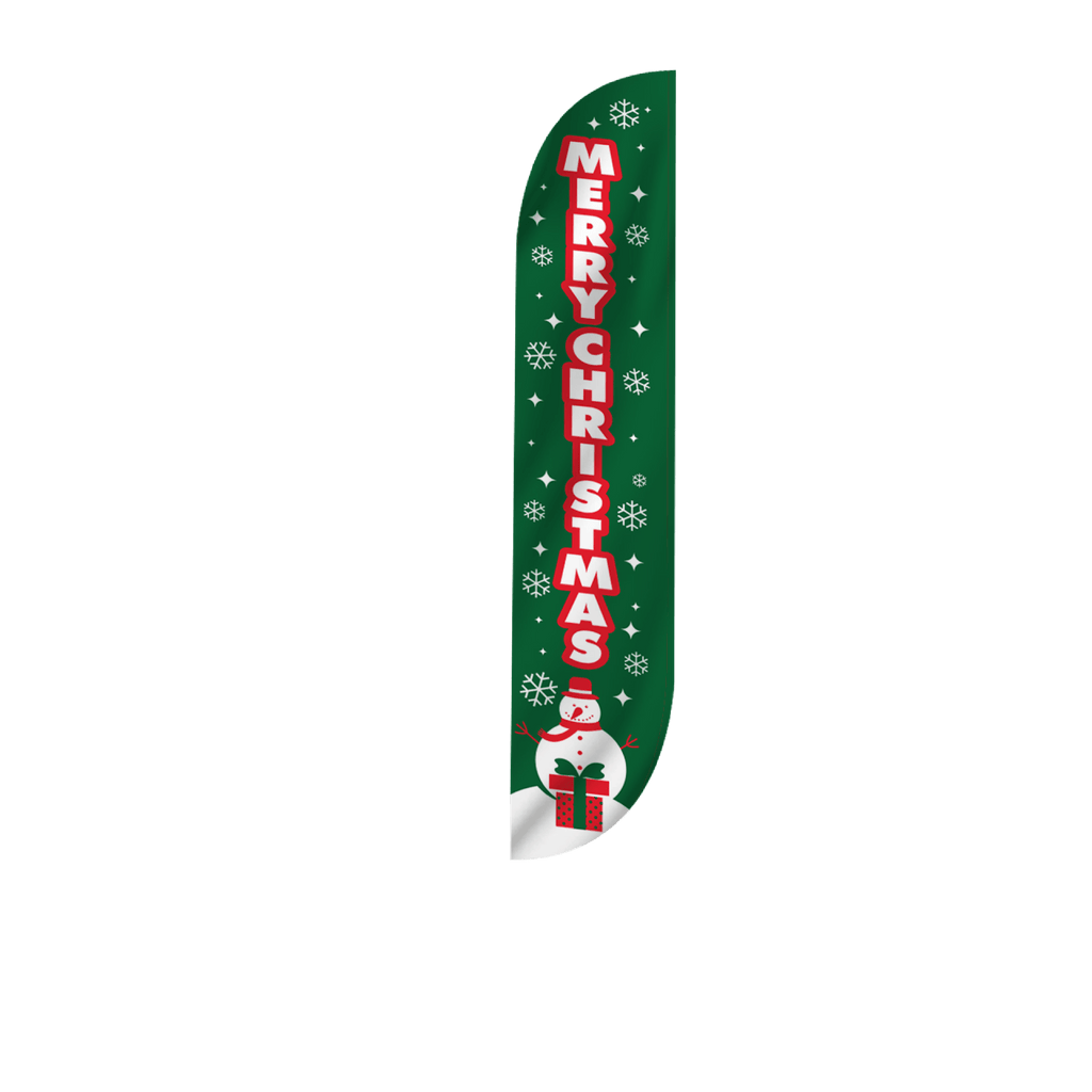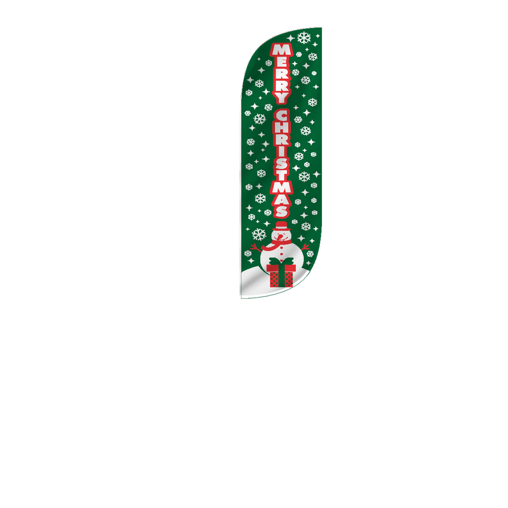 If you happen to see another online shop that offers a lower price than us within six months of your date please let us know and we’ll be happy to refund the difference on your original payment method. Moreover, because we are consistently working with our suppliers to get better rates we know that you can feel very comfortable and confident that you are seeing the best prices that can be provided for the products listed on our site. Moving forward if you find the same item that we carry on another website that has a lower price please submit that to us within six months of your purchase date and we will refund you the difference. If it is a case of seeing a lower price on another website and we need to send a partial refund simply email us the link to the exact product and brand from our site and also the link from our competitors site so we can inspect the pricing. Again this needs to be within six months from the date of your order and we will review your submission and apply a credit if necessary. Our 100% Shoppers Best Price Guarantee has some limitations: The item must have already been purchased from our site prior to asking for this to be reviewed and submitted. This does not include rebate programs or specific retailer programs such as buy three get one free type offers or any combination such as that are not eligible The item will need to be in stock from the competitors site that you’re submitting the information from The competitor must be an online store, they may not have a retail location (warehouse, showroom, or physical location) The website cannot be a wholesaler, liquidator, distributor, or auction website. Examples are eBay, Liquadation.com, Via Trading, overstock, etc. The competitor must also be someone who has been authorized by the supplier and/or manufacturer to resell the product you are inquiring about The Shoppers Best Price Policy must also include the product listing price and the shipping total, but will exclude any sales tax that gets added at the final purchasing invoiceNothing says Christmas spirit like our Large 12ft Merry Christmas feather flag! Share the Christmas spirit with this seasonal feather flag. A green background hosts falling white snowflakes and a snowman at the bottom, this festive design has the words “MERRY CHRISTMAS” printed boldly vertically down the flag. Whether you are marketing a business, or celebrating a Christmas party, this flag will surely send the right message and is the perfect way to do so.
