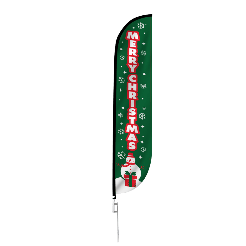 Nothing says Christmas spirit like our Large 12ft Merry Christmas feather flag! Share the Christmas spirit with this seasonal feather flag. A green background hosts falling white snowflakes and a snowman at the bottom, this festive design has the words “MERRY CHRISTMAS” printed boldly vertically down the flag. Whether you are marketing a business, or celebrating a Christmas party, this flag will surely send the right message and is the perfect way to do so.