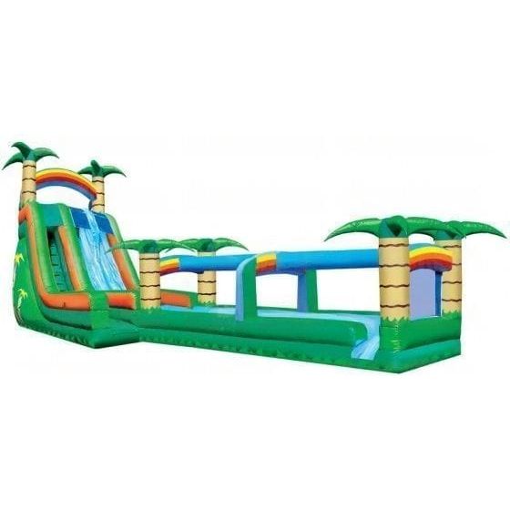 Our 22' Tropical 2 Lane Run 'N' Splash Combo features a radical sliding angle that's sure to get the adrenaline pumping. At the bottom, riders continue down 26' of additional sliding fun before landing in the splash down pool. This combo water slide will blow your mind! This unit is perfect for schools, churches, summer camps and more. Teenagers will love this ride!